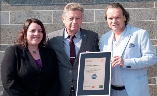 Dr. Andrea Rimkus (RAL Umwelt/RAL Environment), Gerhard Florian (Betriebsleiter Druckpartner), Michael Matschuck (Geschäftsführer Druckpartner) bei der feierlichen Verleihung des Blauen Engel in Bonn (v.l.).