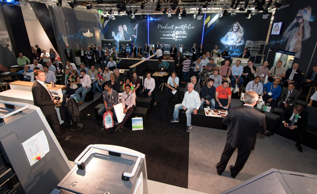 Auf einer Bogenoffset-Druckmaschine (Heidelberg Speedmaster CX 102-5+LX2) werden viermal täglich eigens für die drupa von IST Metz entwickelte Druckprodukte live produziert. Dabei handelt es sich um ein wiederverwendbares Verpackungskonzept sowie einen Commercial-Printjob. Sowohl die herkömmliche Lampcure- als auch die neuere LED-cure-Technologie kommen während der Live-Druckdemonstrationen zum Einsatz. Dabei soll die Speedmaster CX 102 alle Materialien vom Dünndruckpapier bis zum biegesteifen Karton verarbeiten. Das in Sekundenschnelle UV-gehärtete Druckprodukt können sich die Besucher anschließend am Stand personalisieren lassen und mit nach Hause nehmen.