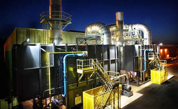 Zwei Cleanswitch-RTOs (Regenerative Thermal Oxidizer) von Megtec im Parallelbetrieb zur Reinigung von VOCs in der Abluft von Flexodruckmaschinen.
