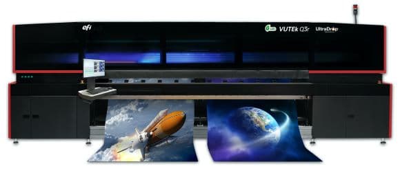 Der schnellste Rolle-zu-Rolle Drucker seiner Klasse für Supergroßformate: Der 3,5 Meter breite LED-Drucker EFI VUTEk Q3r aus der VUTEk-Q-Serie, zu der auch der 5,2 Meter breite VUTEk Q5r gehört, bietet ein neues Inline-System zur Prüfung der Druckqualität. Neu ist auch die Option UltraClear Coat, eine Laminierung für mehr Design- und Anwendungsmöglichkeiten.