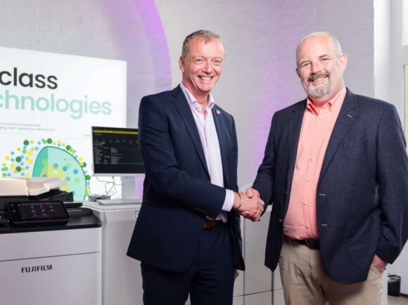 Sie freuen sich über die erste ApeosPro C in Großbritannien: Martin Fairweather (National Digital Business Development Manager, Fujifilm UK) und Jamie Emmerson (Director, Emmerson Press).(Bild: Fujifilm)