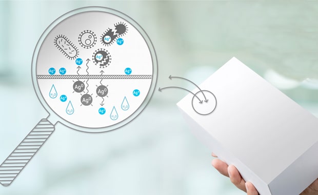 Durch Feuchtigkeit werden aus den im Lackfilm fest verankerten elementaren Silber-Nanopartikeln positiv geladene Silberionen herausgelöst und freigesetzt, die an der Oberfläche des Lacks die Anzahl von Bakterien und Viren maßgeblich reduzieren sollen.