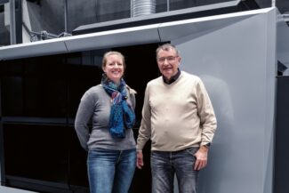 Die Gremper AG in der Schweiz ist der weltweit erste Anwender des industriellen Inkjet-Systems Jetfire 50 von Heidelberg. Cilgia Gremper, CEO Gremper AG, zusammen mit Karl Gremper, Verwaltungsratspräsident Gremper AG vor der Jetfire im Home of Print von Heidelberg am Standort Wiesloch-Walldorf.