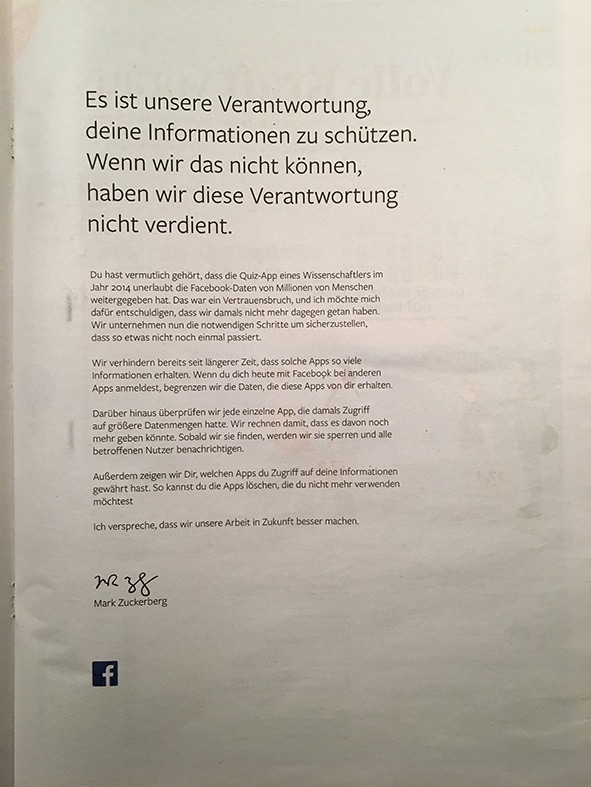 “Du hast vermutlich gehört, dass die Quiz-App eines Wissenschaftlers im Jahr 2014 unerlaubt die Facebook-Daten von Millionen von Menschen weitergegeben hat”, so stand es auf der ganzseitigen Anzeige, die am heutigen Dienstag unter anderem im “Handelsblatt”, der “Süddeutschen Zeitung” und der “Frankfurter Allgemeinen Zeitung” abgedruckt war. “Das war ein Vertrauensbruch, und ich möchte mich dafür entschuldigen, dass wir damals nicht mehr dagegen getan haben.” Der Konzern wolle nun die notwendigen Schritte unternehmen, um sicherzustellen, dass so etwas nicht noch einmal passiere. Unter dem Schreiben die Unterschrift von Zuckerberg.