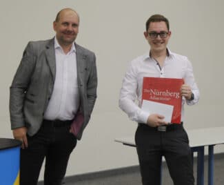 Andreas Krause, 1. Vorsitzender des FDI-Bezirk Nürnberg, überreichte dem Jahrgangsbesten einen Buchpreis. (Bild: Michael Paß)