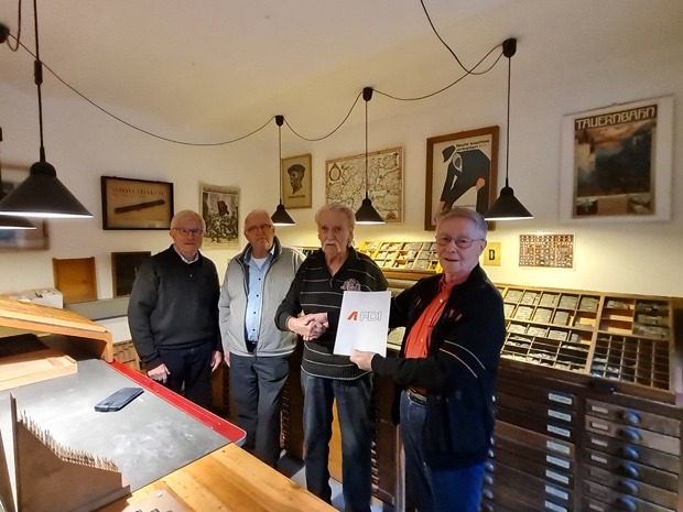 Es sei daher dem FDI eine Herzensangelegenheit, dieses historische Museum zu unterstützen und zu helfen, dass die alte Buchdruckerkunst weiterhin Interessierten gezeigt werden könne, erklärte Burkhard Jägerfeld, 1. Vorsitzender des FDI-Bezirks. Der Vorsitzende des Trägervereins Wolfgang Schmidt bedankte sich beim FDI für den monetären Beitrag zur Unterstützung des Fördervereins, der in der jetzigen Situation hilft, die finanzielle Lage zu verbessern.