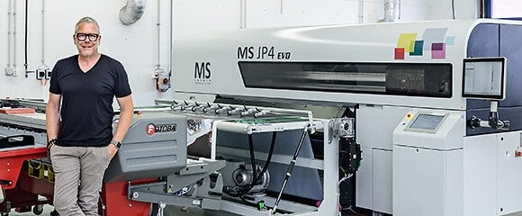Steffen Tomasi vor der Digitaldruckmaschine MS JP4 EVO.(Bild: Ulrike Sommer)