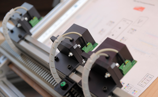 Um das Auswerten der Testbögen zu beschleunigen, haben die Ingenieure der Fogra unter anderem einen Passer-Messtisch entwickelt, der die Kontrollelemente über fest installierte Kameras exakt ausmessen und die erhaltenen Werte an die Software übergeben kann.(Bild: Fogra)