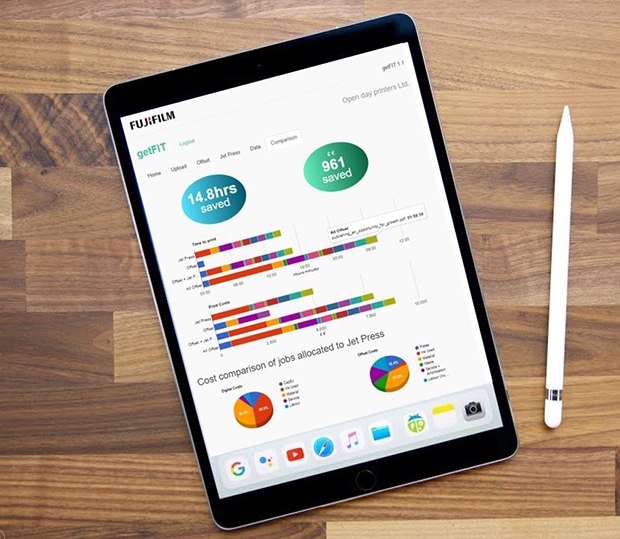 Mit “Get fit” hat Fujifilm eine App auf Webbasis vorgestellt, mit der Anwender den Digitaldruck auf der Jet Press 720S mit dem Offsetdruck vergleichen können. Dazu werden laut Hersteller die tatsächlichen Aufträge und Produktionsbedingungen eines Druckdienstleisters, beispielsweise der Einsatz von Tinten/Druckfarben, Ressourcen und Zeit auf der Jet Press mit den vorhandenen Offsetdruckmaschinen gegenübergestellt.