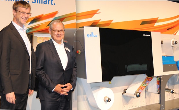 Die neue Gallus Smartfire ermöglicht einen Einstig in den digitalen Etikettendruck (links Stephan Plenz, Heidelberg, daneben Ferdinand E. Rüesch, Gallus).