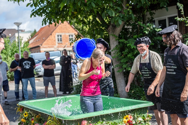 Vor der “Druckertaufe” im Wasser musste die Absolventin zur “innerlichen Reinigung” einen Rollmops verspeisen sowie Bier trinken. “So knie nieder und tue Buße, sogleich kommt nun die leichte Muße”, leitete ihr Ausbildungsleiter Dietmar Michel die Zeremonie ein. Im Anschluss wurde ein nasser Schwamm über ihrem Kopf ausgedrückt – ein Vorgeschmack auf das eigentliche Gautschen.