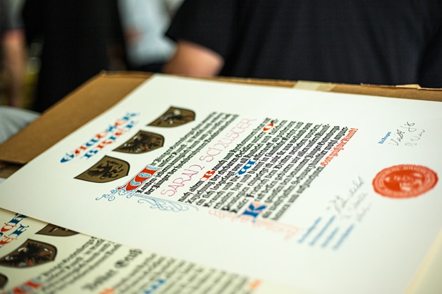 Auf dem Weg zur “Druckertaufe”: Sarah Schuster und ihre Kollegen.Die Urkunde bestätigt Sarah Schusters “Druckertaufe”.
