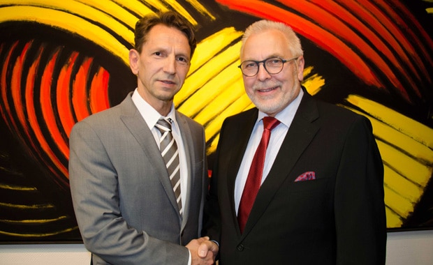 Andrej Günther (l.) ist in die Geschäftsführung von GCC eingetreten. Rechts Manfred Cuno, Geschäftsführender Gesellschafter des Grafischen Centrums Cuno in Calbe.
