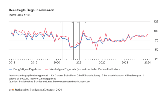 Seit Juni 2023 sind damit durchgängig zweistellige Zuwachsraten im Vorjahresvergleich zu beobachten, wobei die Insolvenzzahlen für diesen Zeitraum insgesamt noch leicht unter dem Niveau des Vor-Corona-Zeitraums Juni 2019 bis Januar 2020 lagen.