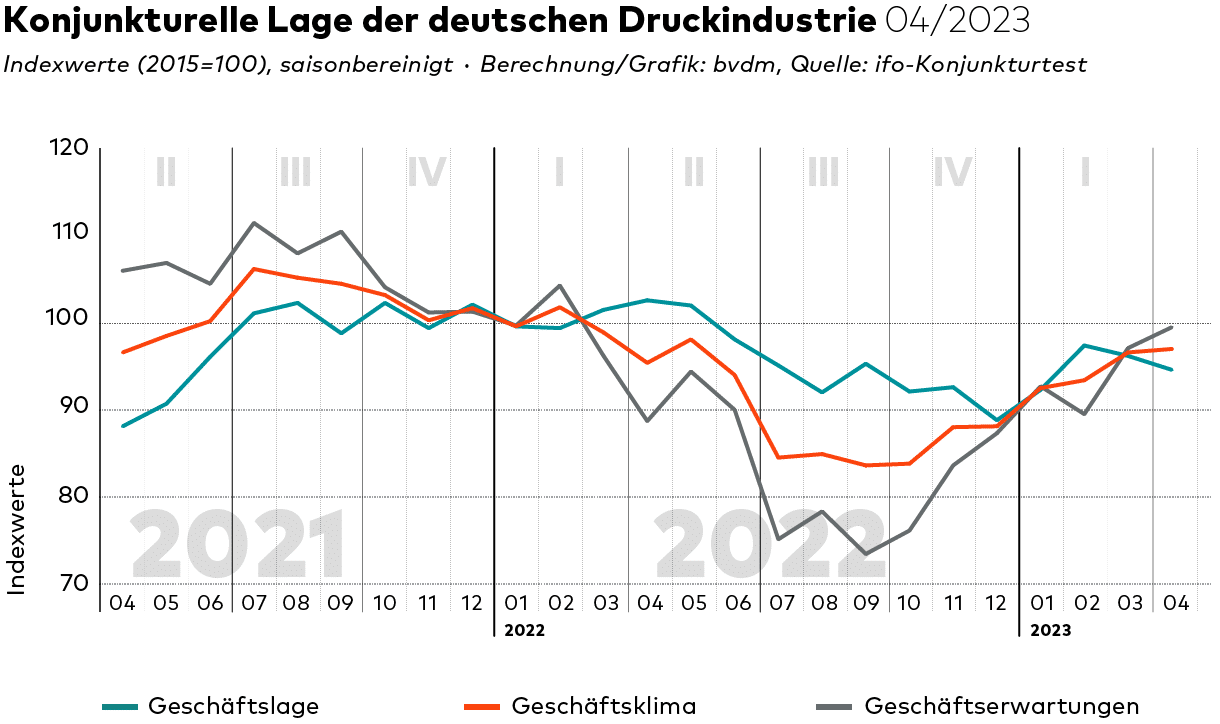 Im April 2023 legte das saison- und kalenderbereinigte Geschäftsklima der deutschen Druck- und Medienbranche leicht zu, sinkende Geschäftslageeinschätzungen bremsten die Entwicklung jedoch erneut aus. Der vom Bundesverband Druck und Medien berechnete Geschäftsklimaindex stieg saisonbereinigt um 0,4 Prozent im Vergleich zum Vormonatsniveau. Mit 97,0 Punkten notierte der Index damit erstmals seit Februar 2022 über seinem Vorjahresniveau.