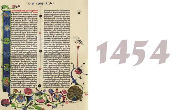 Im Jahr 1454 wird die erste "Gutenberg-Bibel" mit einem 42-zeiligen Seitenaufbau gedruckt.