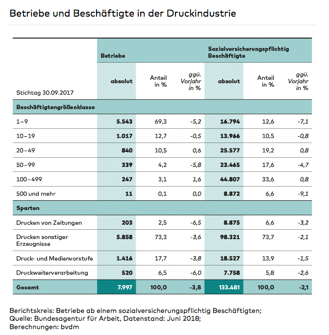 Das Druckgewerbe ist klein- und mittelständisch geprägt. Aktuell beschäftigen die rund 8.000 Unternehmen beschäftigen rund 135.000 Mitarbeiter. Knapp 83 Prozent der Betriebe zählen weniger als 20 sozialversicherungspflichtig Beschäftigte. In diesen Druckereien ist allerdings nur rund 23 Prozent des gesamten Personals in der Druckindustrie tätig. Das Gros der Beschäftigten arbeitet in Unternehmen, die mehr als 20 Mitarbeiter haben.