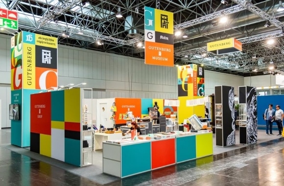 Mit einem gemeinsamen Messestand präsentierten sich Gutenberg-Stiftung, Gutenberg-Museum und Gutenberg-Gesellschaft auf der Drupa in Düsseldorf. (Bild: Markus Kohz)