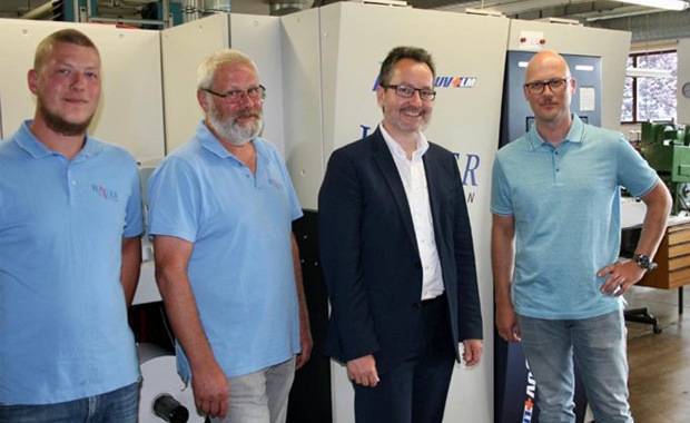 Hauer Etiketten aus dem österreichischen Aigen im Mühlkreis hat in eine Screen Truepress Jet L350UV+LM investiert. Im Bild: Rudolf Hauer, Martin Hauer, Martin Strobel vom Vertriebspartner MCA PRO GmbH und Manfred Hauer.(Bild: Screen)