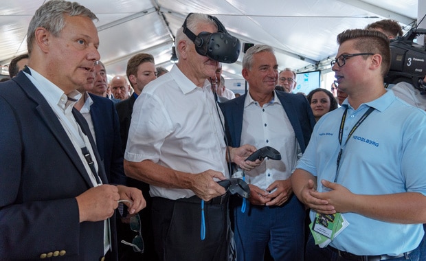 Ministerpräsident Winfried Kretschmann (mit VR-Brille) und Digitalisierungsminister Thomas Strobl (Mitte) lassen sich von Professor Dr. Rupert Felder (links), Leiter Human Resources bei Heidelberg und einem Heidelberg Azubi (rechts) die Möglichkeiten von Virtual Reality (VR) erläutern.
