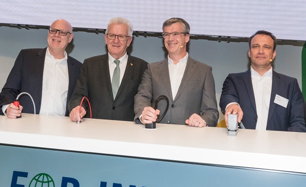 Gemeinsam eröffnen Baden-Württembergs Ministerpräsident Winfried Kretschmann (2.v.l.) und Heidelberg CEO Rainer Hundsdörfer (l.), Stephan Plenz, Vorstand Heidelberg Technology (3.v.l.) und Frank Kropp, Leiter Forschung & Entwicklung (r.), vor rund 200 geladenen Gästen das neue Innovationszentrum am Standort Wiesloch-Walldorf.