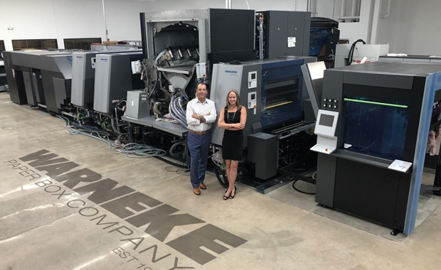 Steve Huppert, Vice President und COO sowie Stacy Warneke, President und CEO, beide Warneke Paper Box, an der neuen Primefire 106.