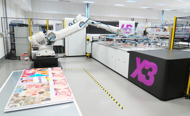 Der neue UV-Flachbettdrucker Onset X3 HS mit Handhabungsroboter bei der offiziellen Premiere am Firmensitz von Inca Digital in Cambridge (UK).
