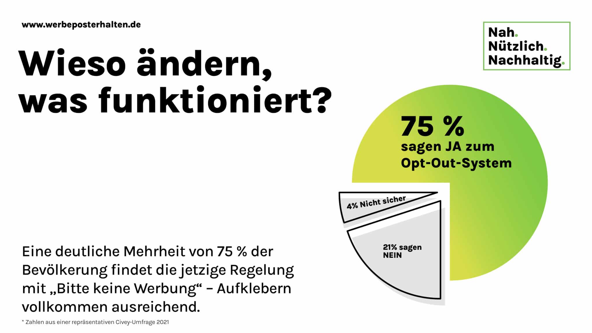 Darüber hinaues gaben in einer aktuellen Umfrage des Meinungsforschungsinstituts Civey für die Initiative 75 Prozent der Haushalte an, mit dem bestehenden Opt-Out-System zufrieden zu sein. Die Druck- und Medienverbände setzen sich daher für den Erhalt von Opt-Out ein.
