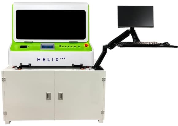 Das Flaggschiff, die UV-Digitaldruckmaschine Helix, die dazu entwickelt wurde, Vollfarbbilder (CMYKWW + Lack) auf zylindrische und konische Produkte zu drucken.