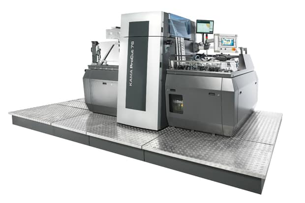 Zu sehen ist die Generation Servo der ProCut 76 Foil mit weiterentwickelten Features und hoher Automatisierung. Die Stanz-, Präge- und Veredelungsmaschine deckt Anwendungen von der Veredelung mit Heißfolie, Hologramm und Reliefschnitt bis zum Stanzen, Rillen und Perforieren ab. Kama präsentiert die ProCut 76 Foil mit dem neuen AutoRegister AR3, das bei voller Geschwindigkeit jeden Bogen exakt in Position bringen soll. Auch schräg gedruckte und geschnittene Bogen würden passergenau justiert, zur X- und Y- Achse plus Schrägverstellung. Die Maschine lässt sich über die JobManager-Software als Schnittstelle mit dem Server des Kunden vernetzen.