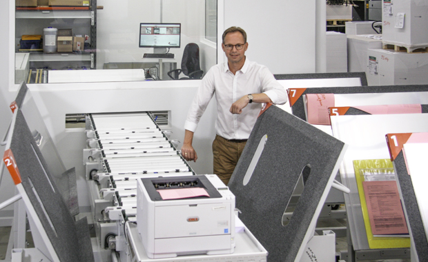Ralf Zarbock, geschäftsführender Gesellschafter des Druck- und Verlagshauses Zarbock, vor der Logistikstrecke der neuen CtP-Anlage.