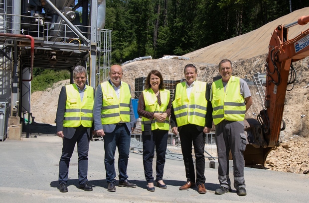 Die Ministerin für Umwelt, Energie und Naturschutz von Thüringen, Anja Siegesmund, informierte sich über den Fortschritt der Dekarbonisierung am Koehler Paper Standort Greiz: Anja Siegesmund von den Grünen, sowie Alexander Schulze (Mitte links, Bürgermeister Stadt Greiz), die von Udo Hollbach (Mitte rechts, Geschäftsführer Koehler Paper Standort Greiz), sowie Jens Kriete (links, Nachhaltigkeitsmanager, Koehler-Gruppe) durch das Werk in Greiz geführt wurden.(Bild: Koehler-Gruppe)