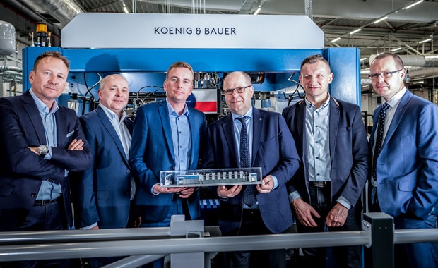 Neu installierter Rapida-Jumbo bei der polnischen Verpackungsdruckerei Werner Kenkel: Das Bild zeigt (v.l.) Adam Kenkel, Wiesław Grabsztunowicz, Damian Kenkel (alle Werner Kenkel), Jan Korenc (Koenig & Bauer), Waldemar Borowiak (Werner Kenkel) und Grzegorz Szymczykowski (Koenig & Bauer) bei der feierlichen Einweihung der Rapida 164.(Bild: Koenig & Bauer)