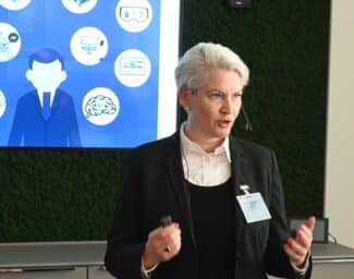 Sandra Wagner (Vice President Digitalization bei Koenig & Bauer), referierte in ihrer Keynote „Wie Koenig & Bauer Ihr Geschäftsmodell unterstützt“ mit Inhalten rund um das Zukunftsthema Digitalisierung. Die Besucher:innen erhielten spannende Denkanstöße, warum Digitalisierung notwendig ist, wie künstliche Intelligenz die Industrie verändert und sogar erste exklusive Einblicke, welche Produktneuheiten auf der Drupa zu erwarten sind.
