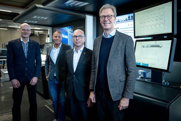 Koenig & Bauer erweitert die Partnerschaft mit System Brunner: V.r.n.l. Ralf Sammeck, Vorstandsmitglied Koenig & Bauer und Geschäftsführer Koenig & Bauer Sheetfed, Daniel Würgler, Vorstand und Managing Owner, System Brunner, Daniel Pfeiffer, Managing Director, System Brunner, und Dirk Winkler, Bereichsleiter Verfahrenstechnik, Koenig & Bauer Sheetfed, am Leitstand einer Rapida 145, die mit Instrument Flight von System Brunner ausgerüstet ist.(Bild: System Brunner)
