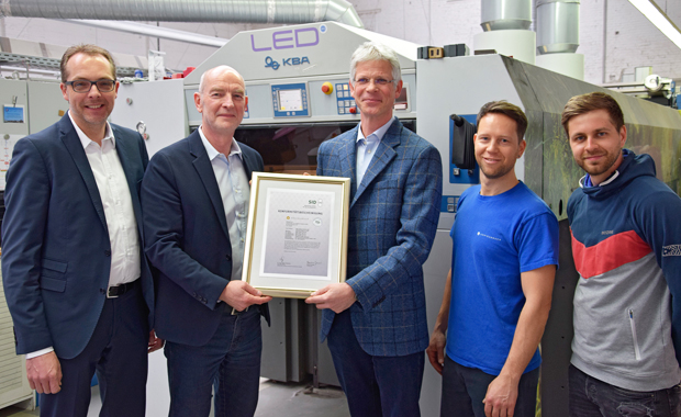 Der geschäftsführende Gesellschafter Olaf König (2. v. l.) erhält die Urkunde von SID-Mitarbeiter Hans-Georg Deicke. Weiterhin beteiligt sind (v. l. n. r.) Geschäftsführer Thomas Bertelt, Dennis Stöter, Drucker und Christopher Stürmer, PSO-Verantwortlicher aus der Druckvorstufe.