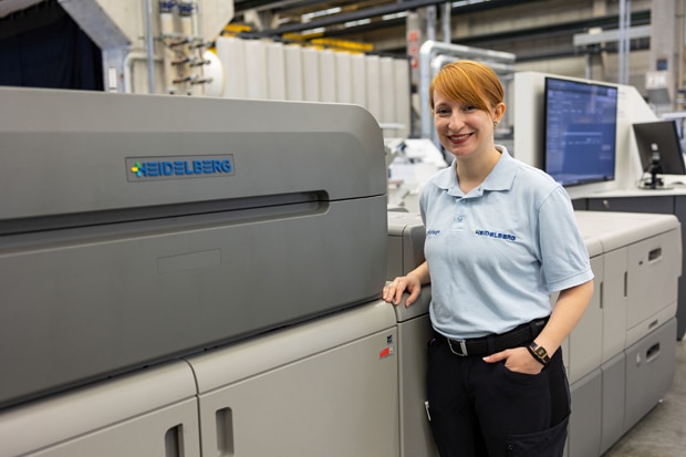 Ihre Ausbildung absolvierte sie im Print Media Center (PMC) des Unternehmens, das in erster Linie als Vorführzentrum für Kunden aus der ganzen Welt dient. „Mit ihrem Hintergrund haben wir Stefanie verstärkt im Digitalbereich eingesetzt, wo wir ja mit Ricoh, einem japanischen Hersteller, kooperieren“, berichtet Bernhard Nahm, Senior Manager Print-Media-Center und Ausbildungsleiter für Medienberufe bei Heidelberg. Für Stefanie Kriege kristallisierte sich im Laufe ihrer Ausbildung eine große Affinität für alles Digitale und damit auch den Digitaldruck heraus: „Ich habe mich sehr gefreut, dass ich bei Heidelberg die Chance hatte, die Digitalzusatzprüfung zu machen.“ Der Digitaldruck hat für sie einen besonderen Reiz: Kriege faszinieren die Individualität, die Vielfalt und die Möglichkeit, sofort und ganz direkt auch mal was ausprobieren zu können bis hin zur Auflage 1. Ein paar Mal durfte Kriege zudem japanische Kunden im PMC in Wiesloch begrüßen und durch den Tag begleiten, ehe Corona solche Termine schwierig machte.