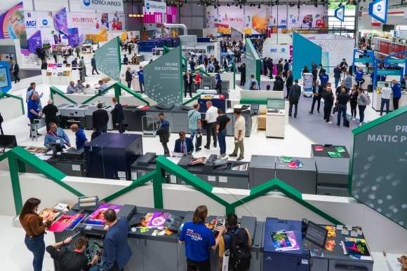 Trotz zurückgegangener Besucherzahlen gegenüber der letzten Drupa registrierte Konica Minolta auf seinem Stand in Halle 8B mehr Besucher als 2016. Das Unternehmen berichtet zudem von über 200 Verkäufen während der Messe.