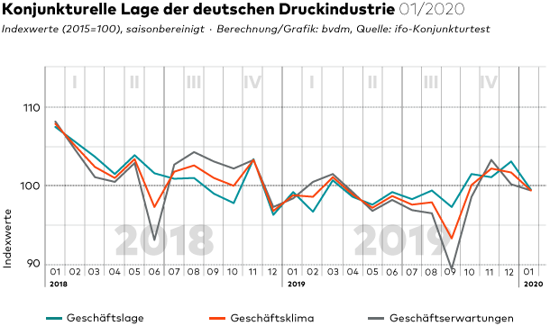 Im Januar bewerteten die vom ifo Institut befragten Druck- und Medienunternehmen sowohl ihre aktuelle Geschäftslage als auch ihre Erwartungen hinsichtlich ihrer Geschäftsentwicklung in den nächsten sechs Monaten schlechter als noch im Dezember. Die Werte der aktuellen und der erwarteten Geschäftslage bestimmen die Entwicklung des Geschäftsklimas, das einen guten Vorlaufindikator für die Produktionsentwicklung der Druck- und Medienindustrie darstellt.
