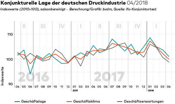 Die vom ifo Institut befragten Druck- und Medienunternehmen beurteilten im April 2018 ihre aktuelle Geschäftslage saisonbereinigt weniger positiv als im Vormonat und revidierten zudem erneut die Erwartungen für die kommenden sechs Monate nach unten. Die Werte beider Einschätzungen bestimmen die Entwicklung des Geschäftsklimas.