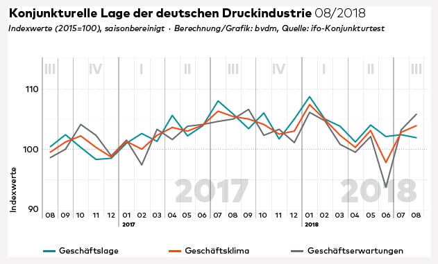 Obwohl sich das Geschäftsklima in der deutschen Druck- und Medienindustrie im August 2018 gegenüber dem Vormonat leicht verbessert hat, blieb es mit negativen 1,5 % weiterhin unter dem Vorjahresstand. Der entsprechende saisonbereinigte Index beträgt nunmehr 103,9 Zähler. Das geht aus dem aktuellen Konjunkturtelegramm des Bundesverbands Druck und Medien hervor.