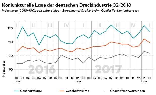 Nach einem positiven Start ins neue Jahr zeigt sich das Geschäftsklima in der Druck- und Medienbranche im Februar 2018 gedämpft. Den Umfragedaten des Ifo Instituts zufolge verschlechterte es sich gegenüber dem Vormonat um 2,4 %. Der entsprechende saisonbereinigte Index sank auf 109,6 Zähler. Im Vorjahresvergleich blieb die Entwicklung hingegen unverändert positiv.