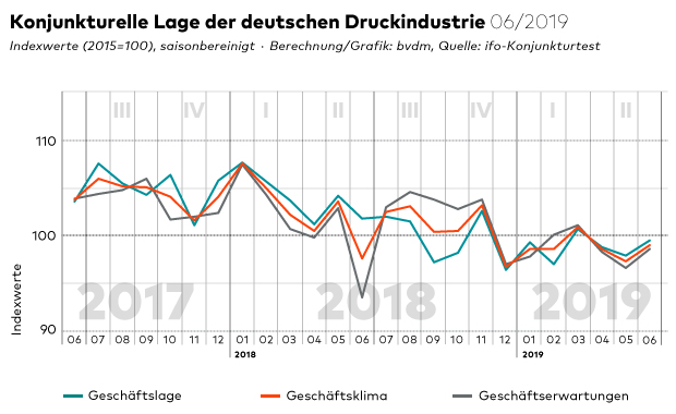 Das zuletzt angespannte Geschäftsklima in der deutschen Druck- und Medienbranche hat sich im Juni 2019 leicht verbessert. Der vom Bundesverband Druck und Medien berechnete Geschäftsklimaindex ist gegenüber dem Vormonat um saisonbereinigte 1,8 Prozent von 97,3 auf 99,0 Zähler angestiegen. Das geht aus dem aktuellen Konjunkturtelegramm des BVDM hervor. Damit liegt der Index zum ersten Mal seit sechs Monaten 1,5 Prozent über dem Vorjahresstand.