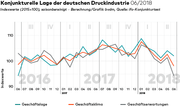 Dennoch sind die Unternehmen zuversichtlich hinsichtlich der kommenden drei Monate – sowohl was die Verkaufspreise als auch die Produktion betrifft. Für die kommenden sechs Monate wurden die allgemeinen Geschäftserwartungen jedoch nach unten revidiert. Der entsprechende saisonbereinigte Index sank gegenüber dem Vormonat um 6,9 Prozent auf 94,3 Zähler. Gegenüber dem Vorjahreswert ging er um 9,8 Prozent zurück. Die Druck- und Medienwirtschaft sei somit optimistisch in Bezug auf das dritte Quartal 2018. Sie sehe jedoch dem in der Regel umsatzträchtigsten vierten Quartal 2018 skeptisch entgegen.