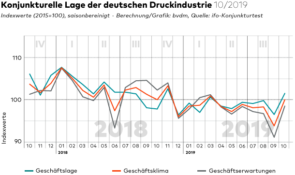 Im Oktober beurteilten die vom ifo Institut befragten Druck- und Medienunternehmen sowohl ihre aktuelle als auch ihre für die kommenden sechs Monate erwartete Geschäftslage deutlich positiver als im September. Die Werte der aktuellen und erwarteten Geschäftslage bestimmen die Entwicklung des Geschäftsklimas, das einen guten Vorlaufindikator für die Produktionsentwicklung der Druck- und Medienindustrie darstellt.