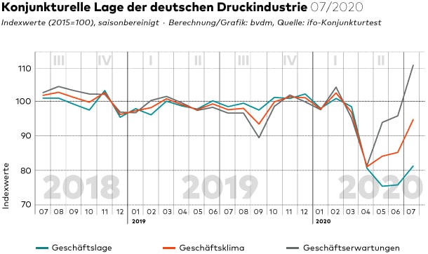 Im Juli bewerteten die vom ifo Institut befragten Druck- und Medienunternehmen sowohl ihre aktuelle Geschäftslage als auch ihre erwartete Geschäftslage sichtlich besser als im Juni. Die Werte der aktuellen und erwarteten Geschäftslage bestimmen die Entwicklung des Geschäftsklimas, das einen guten Vorlaufindikator für die Produktionsentwicklung der Druck- und Medienindustrie darstellt.