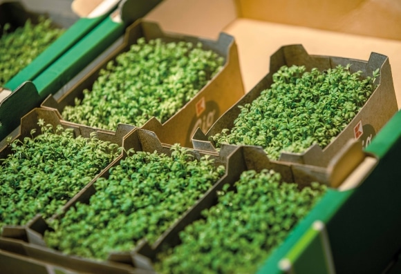 Silphie-Verpackungen werden seit diesem Jahr bei der Kaufland Eigenmarke K-Bio für die Gemüsesorten Kresse, weiße und braune Champignons sowie Tomaten als Verpackungen eingesetzt. (Bild: Kaufland)