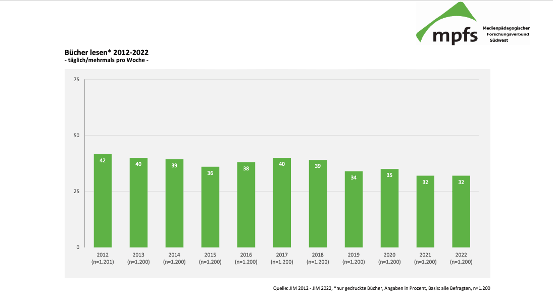 Diejüngsten Ergebnisse der JIM–Studie 2022, die vom Medienpädagogischen Forschungsverbund Südwest veröffentlicht wurde, zeigenaber, dass Lesen im Alltag der Jugendlichenweiterhin stagniert. Nahmen 2012 noch 42 Prozent der Jugendlichen ein Buch in ihrer Freizeit in die Hand, sind es heute nur noch 32 Prozent, was dem Vorjahresniveau entspricht. Auch die durchschnittliche Lesedauer, die zur Hochphase der Pandemie deutlich angestiegen ist, ist wieder auf den Stand von 2019 gesunken: sie liegt nun wieder bei durchschnittlich 53 Minuten täglich (2021: 59 Minuten, 2020: 74 Minuten, 2019: 53 Minuten).