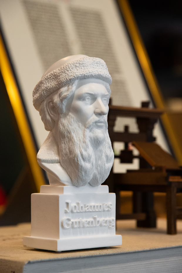 Besucher der Mainzer Minipressen-Messe (30. Mai bis 2. Juni 2019) werden im Entrée der Rheingoldhalle von Johannes Gutenberg empfangen – zumindest von Fan-Artikeln mit seinem Konterfei – vertreten durch den Freundeskreis Gutenberg, Gutenberg Stiftung und Gutenberg-Shop.