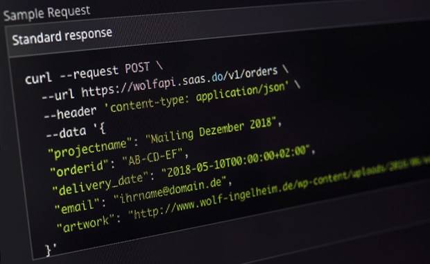 Eine REST-API ist eine Programmierschnittstelle zur Kommunikation zwischen webbasierten Anwendungen bzw. zur Verbindung und Interaktion mit Clouddiensten. Über die REST-API werden Aufträge und Druckdaten an die Wolf-Gruppe übermittelt, aber auch der Austausch von Produktionsstatus, Trackingnummern oder Rechnungen ist möglich. Ebenso können Onlineshops oder ERP-Systeme über eine REST-API wesentlich einfacher angebunden werden. REST-APIs sind derzeit das heiße Thema in der Branche, wenn es um Schnittstellen-Technik geht.